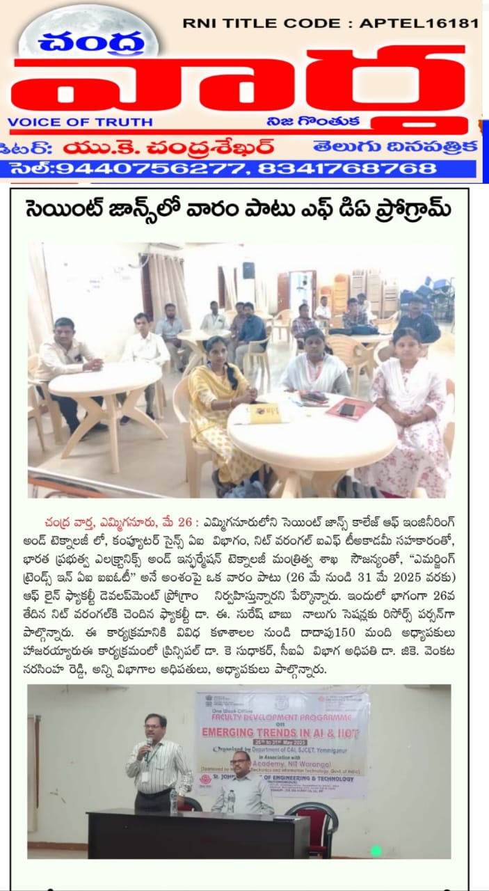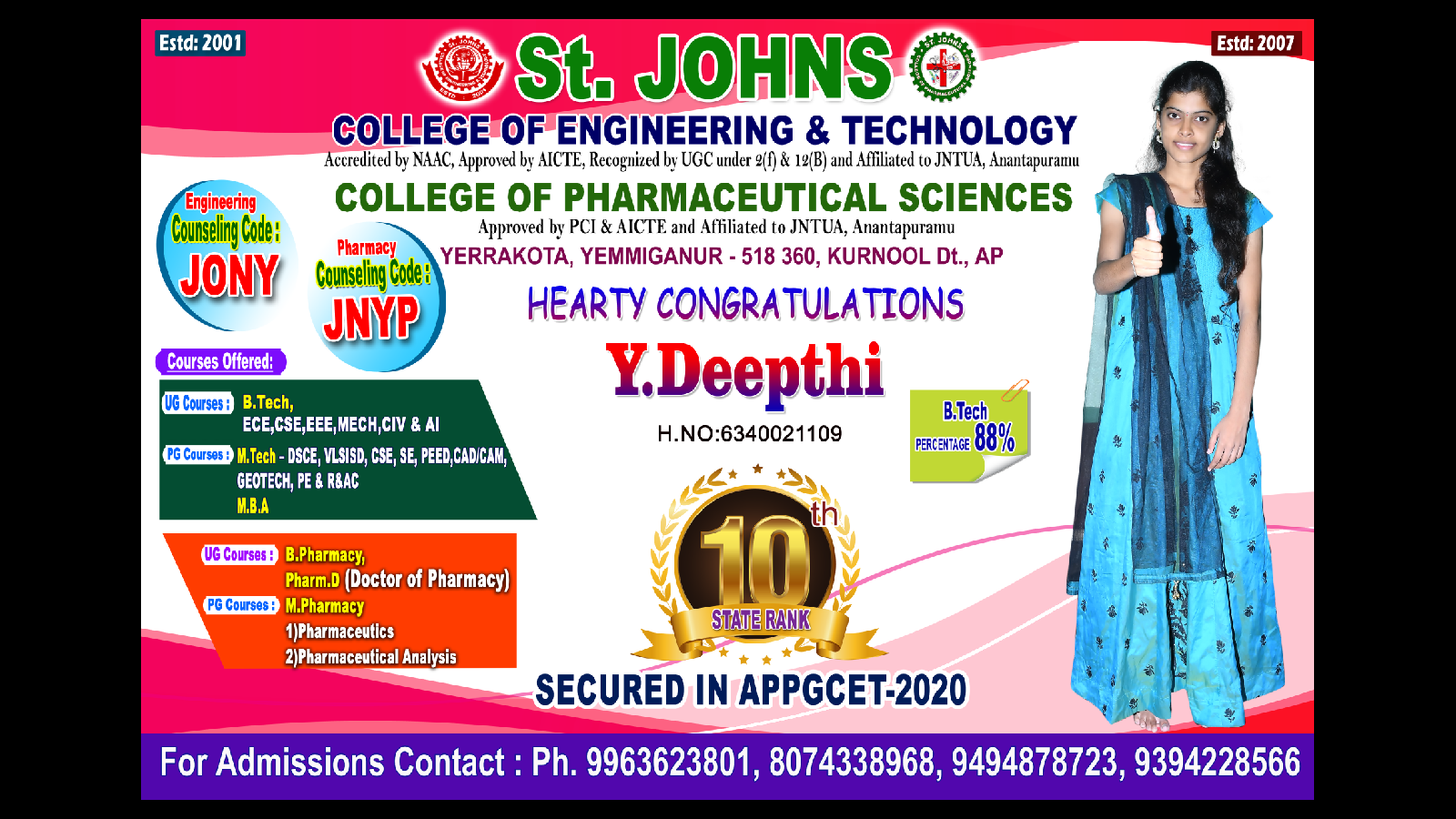 Y.Deepthi,Student of St.Johns College of Engineering & Technology Studied ECE brach secured State 10 th rank in APPGCET entrance exam-2020